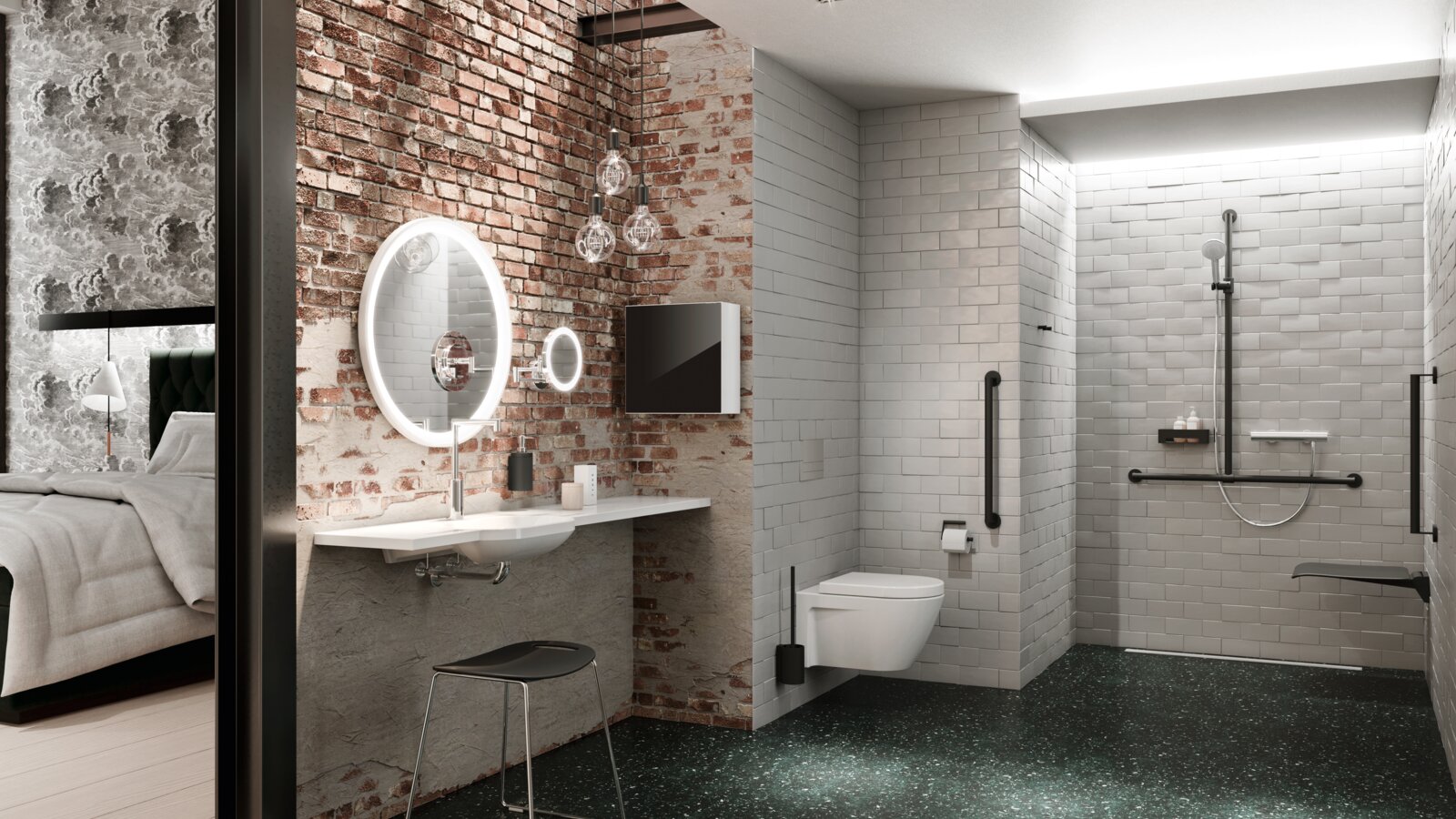 Trotz der DIN-Anforderungen, die es umzusetzen gilt, müssen sich Barrierefreiheit, Komfort und Design nicht ausschließen – ganz im Gegenteil. Bei HEWI werden diese Themen zu einer festen Einheit. Mobile Lösungen von HEWI erlauben es, das barrierefreie Hotelzimmer ganz an die Bedürfnisse der Nutzenden anzupassen. System 900 beispielsweise passt sich flexibel an. Dank mobiler Duschsitze und Stützklappgriffe können Hotels jeden Raum binnen weniger Sekunden in ein barrierefreies Hotelzimmer umbauen. Ist die mobile Lösung nicht mehr nötig, verschwindet sie dezent hinter einer Abdeckung der Montageplatte.