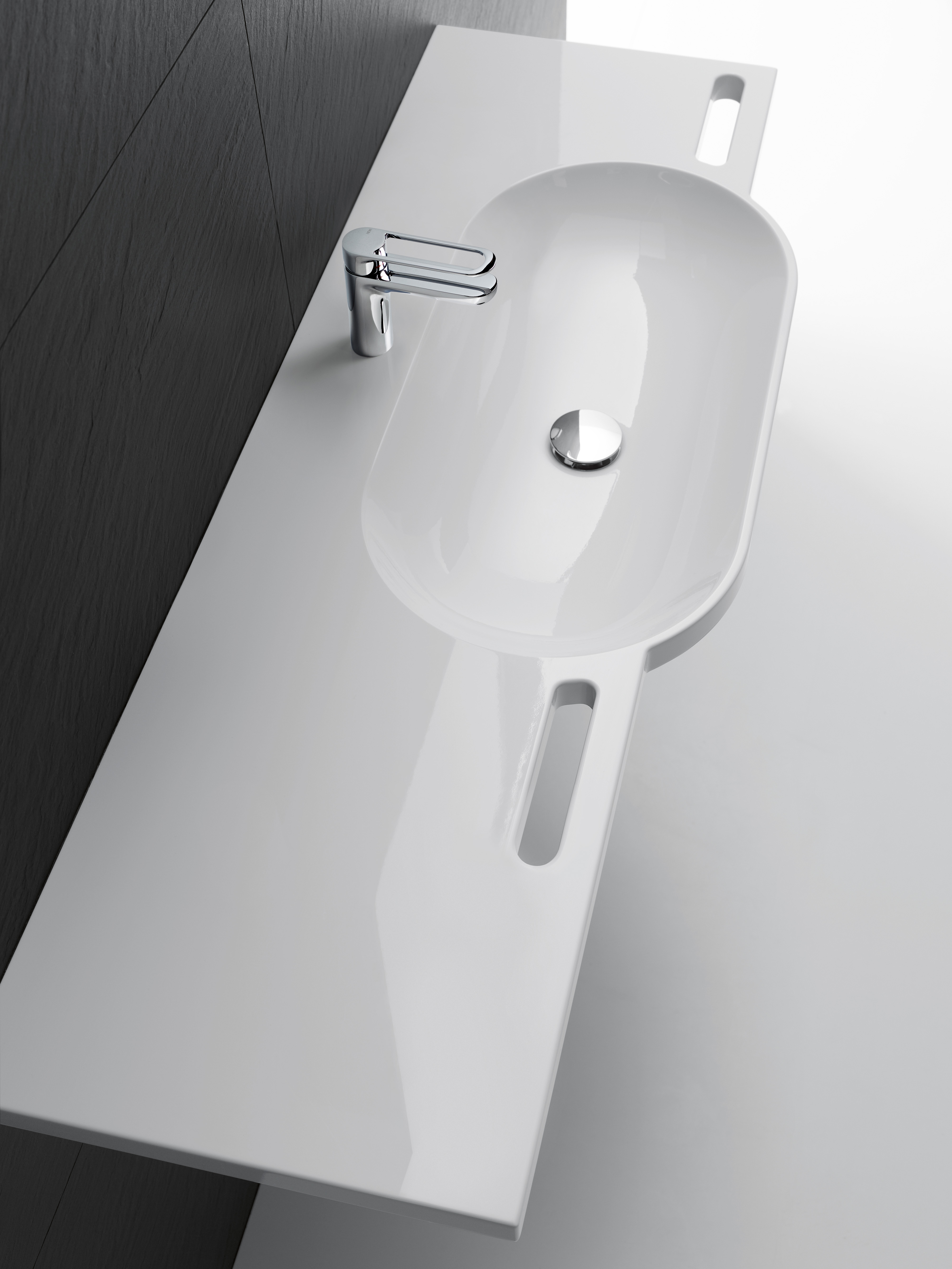 The models have an oval basin and front-mounted grab rails that can also be used as towel rails. Customized washbasins allow solutions to be realized that are a perfect fit, so that the washbasins can be perfectly integrated into the sanitary room.